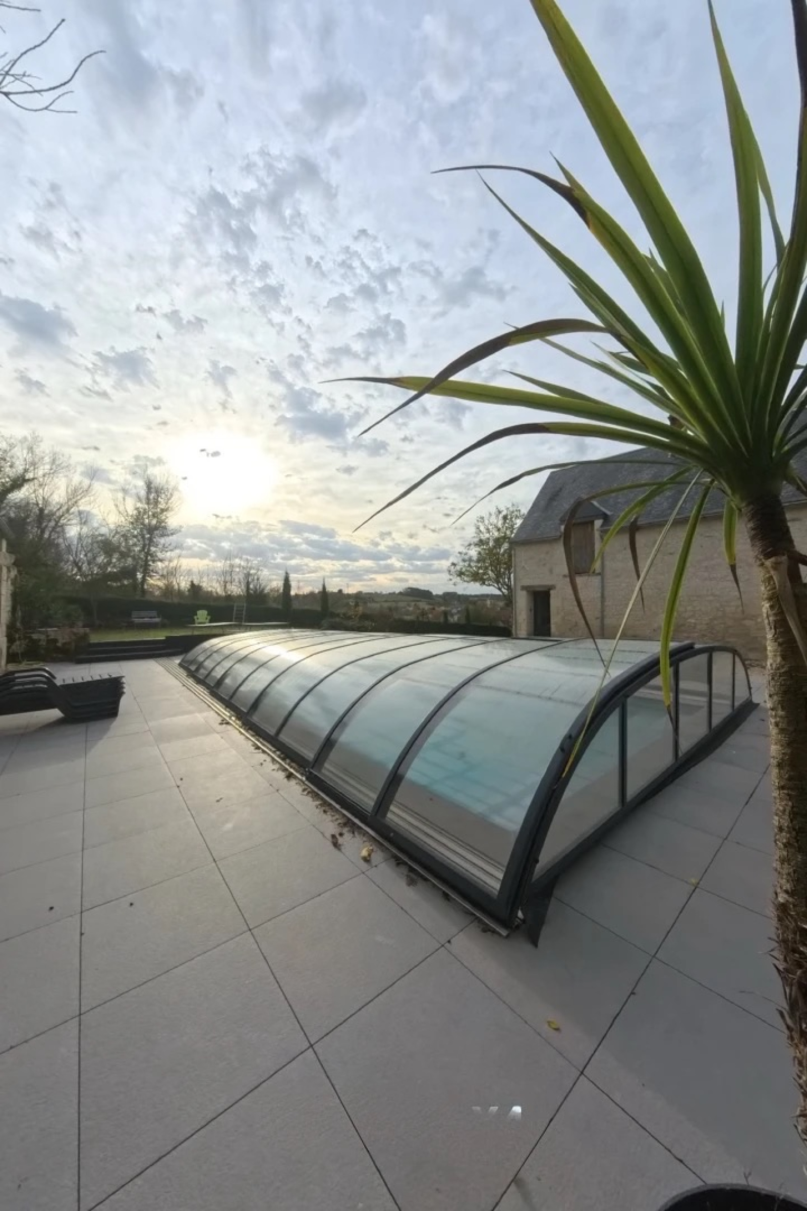 Extérieurs remarquables : piscine, terrasse de 50 m², jardin paysager, 15 places de parking, et une vue dégagée sur les champs.